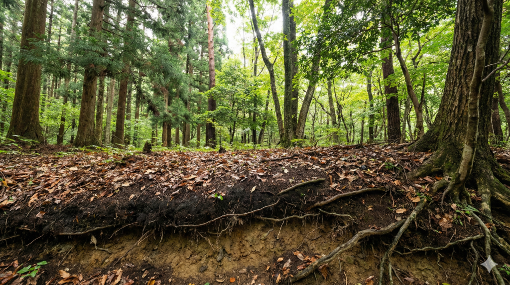 この複雑な層構造は、林土が単なる「土」ではなく、生命活動の記録と循環の場であることを示しています。