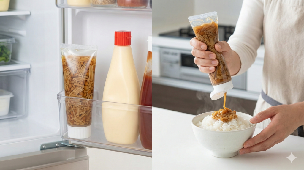 一方、チューブタイプのなめたけであれば、冷蔵庫から取り出し、ワンタッチでキャップを開け、片手で必要な分量だけを絞り出すことが可能です。この「ワンハンドオペレーション」は、調理中の動線をスムーズにし、他の作業をしながらでも味付けができるという利便性を提供します。例えば、フライパンを振りながら隠し味として投入したり、おにぎりを握る最中に具材として注入したりといった動作が、ストレスなく行えるのです。洗い物が減るという点も含め、家事の負担軽減に対する貢献度は非常に高いと言えます。