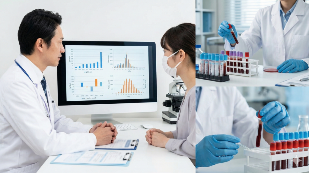 スギアレルギーの診断や重症度判定において、血液検査によるIgE値は最もポピュラーな指標ですが、それ以外にも重要な「数値」が存在します。例えば、「好酸球数」の検査です。好酸球は白血球の一種で、アレルギー反応が起きている時に増加する性質があります。血液中の好酸球の割合や絶対数を調べることで、現在進行形で体の中でアレルギー炎症が起きているかどうかを数値で知ることができます。また、鼻汁を採取して顕微鏡で調べる「鼻汁好酸球検査」では、鼻の粘膜における局所的なアレルギー反応の強さをスコア化することができます。