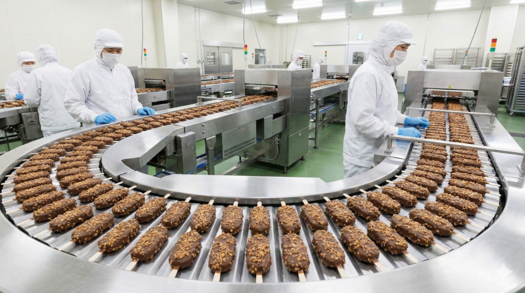 竹下製菓の製造現場は、常に進化を続けています。主力商品であるブラックモンブランは、1969年の誕生以来、その基本構造を変えることなく愛され続けてきました。しかし、その製造工程においては、時代に合わせた最新の設備導入と、職人技にも通じる繊細な調整が繰り返されています。工場内では、まずアイスクリームのベースとなるミックスが調合され、滑らかな舌触りを実現するためにフリージングされます。その後、棒が差し込まれたアイスが成形され、いよいよ最大の特徴であるチョコレートのコーティング工程へと進みます。このコーティングの温度管理こそが、パリッとした食感を生む鍵となります。さらに、表面を覆うクランチは、竹下製菓独自のレシピで作られた特別なものであり、これが均一に付着するように高度な技術が用いられています。製造ラインの各所には、厳しい検品体制が敷かれており、形や重さ、包装の状態に至るまで、一点の妥協も許されないチェックが行われています。こうした徹底した品質へのこだわりが、半世紀以上にわたってブランドを守り続けてきた源泉なのです。