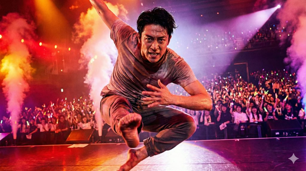 ライブの後半、体力的にも厳しくなってくる場面でこそ、彼の精神力の強さが際立ちます。汗にまみれ、息が上がっている状態でも、動きのキレを失うどころか、むしろその極限状態を楽しむかのような鬼気迫る表情を見せることがあります。この「生の感情」が乗ったダンスは、映像では伝えきれない熱量を持って観客の心に直接響きます。