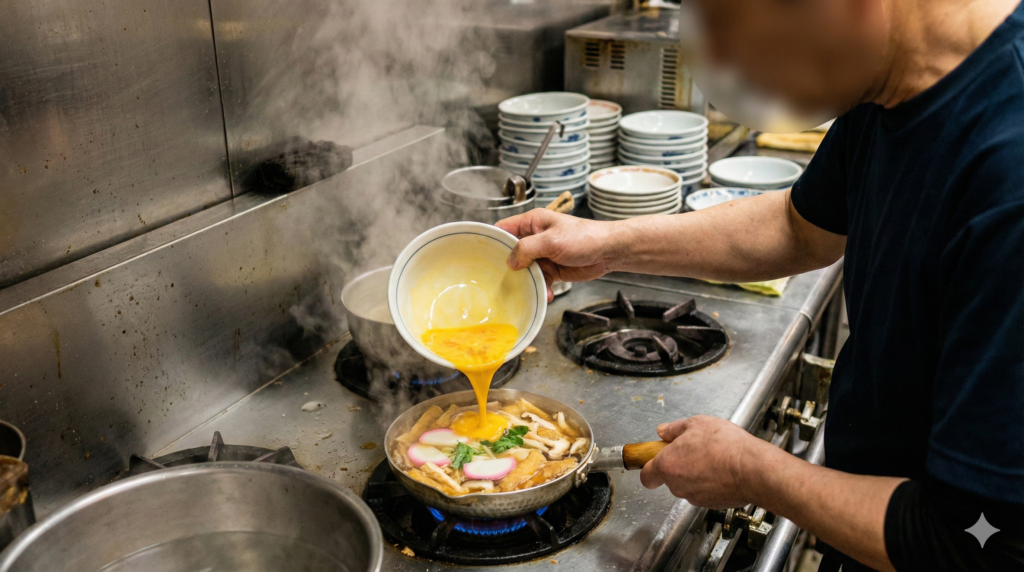 • 余熱の活用「火を止めてから蓋をして蒸らす」という工程は、調理を「熱源」から「余熱」に切り替える重要な瞬間です。火にかけたまま完璧を目指すと、丼に盛り付けるまでの数秒で火が入りすぎ、失敗します。「少し早いかな?」と思う、中央部が生の状態で火を止める勇気が、1位の「とろふわ」食感を生み出すのです。