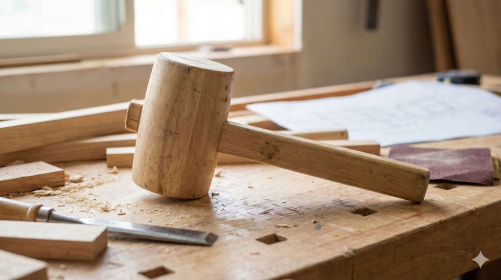 - ノミ(鑿)の柄を叩く: 木工において、ノミの柄尻は木製(または樹脂製)であり、これを金属ハンマーで叩くと柄が割れたり潰れたりします。「木(木槌)で木(ノミの柄)を叩く」ことで、ノミに適切な衝撃を与えつつ、道具の損傷を防ぎます。