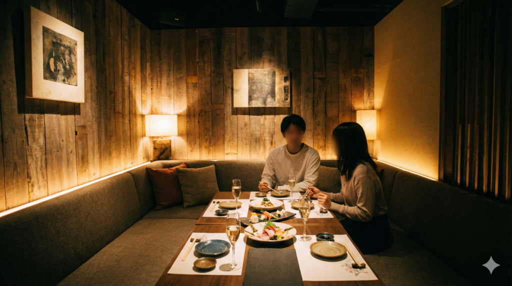 デートにおいて最も重要なのは「二人だけの世界」に浸れることです。本厚木のおしゃれな居酒屋の多くは、単に広い部屋を仕切るだけでなく、最初から「二人利用」を想定したコンパクトな個室を用意しています。こうした個室は、物理的な距離が自然と近くなるように設計されており、L字型のソファーシートや、横並びのペアシートが採用されているケースも多々あります。壁の素材には防音性の高いものが使われたり、視線を完全に遮る扉が設置されていたりと、プライバシーへの配慮も徹底されています。狭すぎず広すぎない、絶妙なサイズ感が安心感を与え、普段は話しにくい将来の話や本音を引き出す効果も期待できるでしょう。