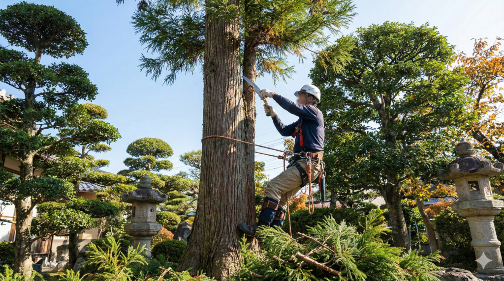「安全性」については前述の通りですが、作業者自身の安全だけでなく、周囲への安全も考慮する必要があります。切った枝が隣家に落ちる、道路に落下して通行人や車に当たる、電線に接触するといったリスクがある場所では、損害賠償問題に発展する可能性もあります。プロの業者は、ロープワークによる枝の吊り切りや、誘導員の配置など、周囲の安全確保においても熟練しています。