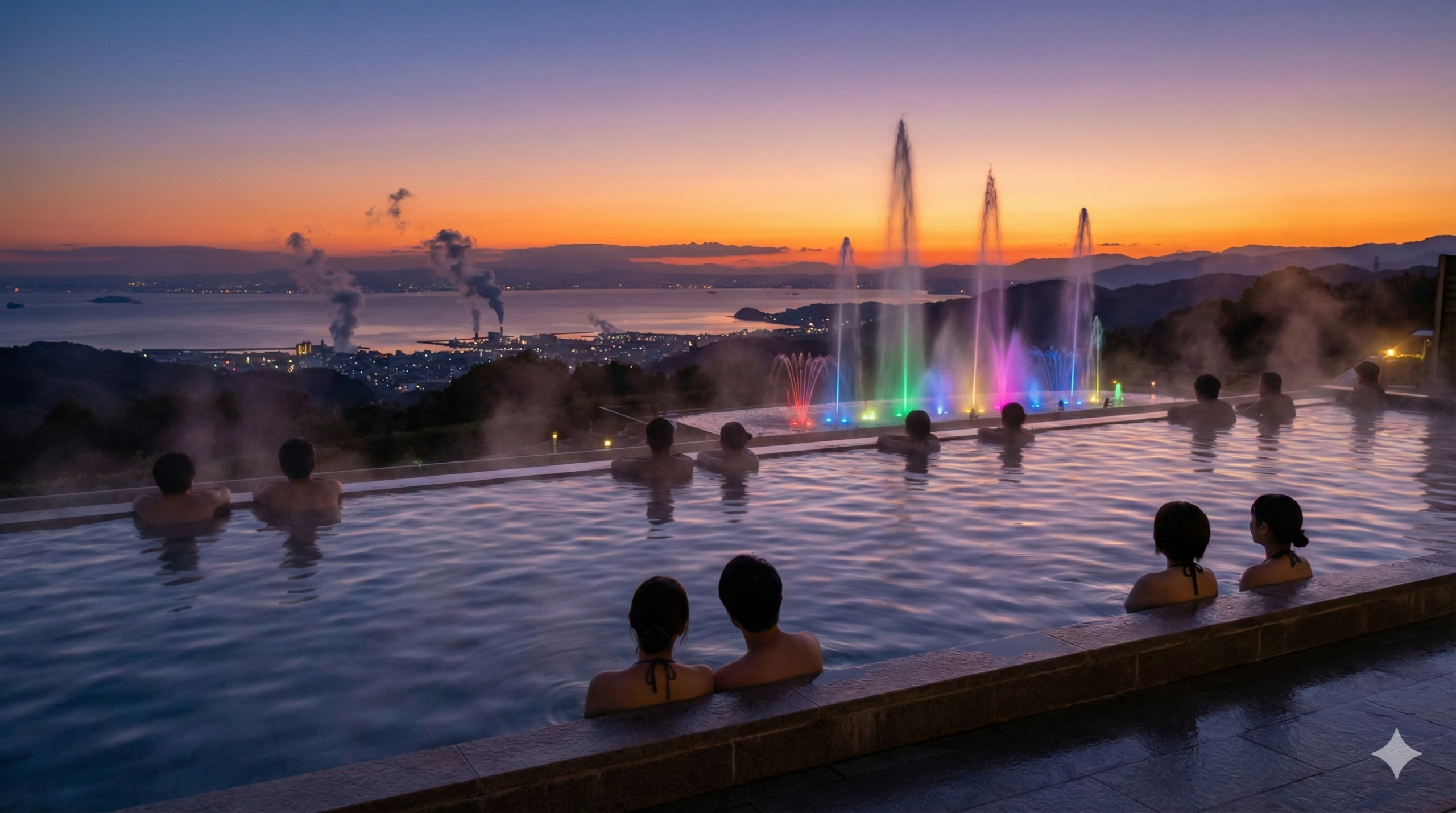 ザ アクアガーデンの最大の特徴は、すべての浴槽に温泉を使用している点です。そのため、冬場の寒い時期であっても、温かいお湯に浸かりながら別府の清涼な空気を楽しむことができます。特に冬の夜、湯気が立ち上る幻想的な雰囲気の中で鑑賞する噴水ショーは、夏とは違った趣があり、多くのリピーターを惹きつけています。