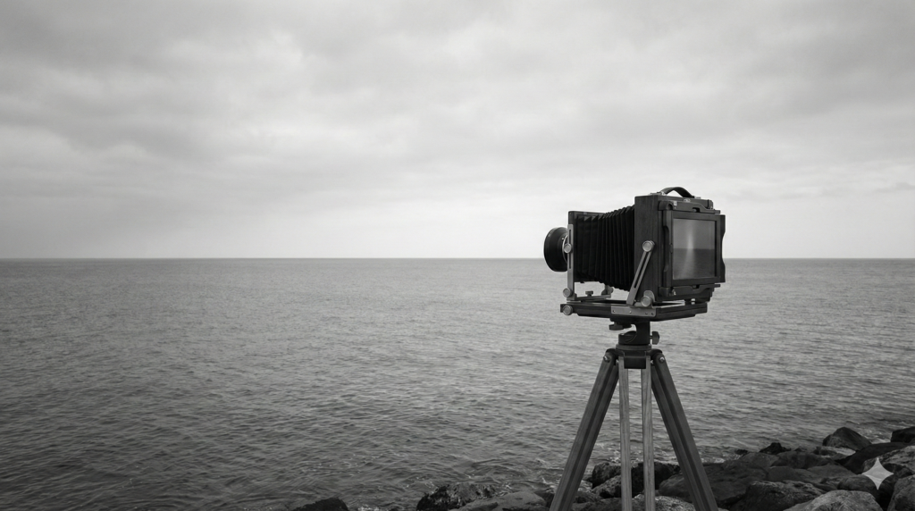 コンセプトの深さもさることながら、杉本博司の作品を支えているのは、妥協のない技術的な完成度です。彼は現代のデジタルカメラではなく、8×10(エイトバイテン)と呼ばれる大型のフィルムカメラを使用しています。このカメラで使用されるフィルムは非常に面積が広く、デジタルでは再現不可能なほどの圧倒的な解像度と階調を持っています。