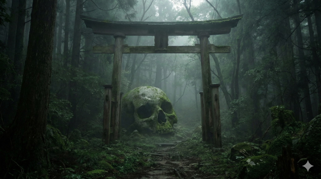 第一の目印として挙げられるのが、朽ち果てた古い鳥居です。神社の入り口を示す通常の鳥居とは異なり、杉沢村の入り口にあるとされる鳥居は、その根本にドクロのような形状をした岩、通称「ドクロ石」が鎮座していると言われています。この鳥居をくぐることは、現世と異界の境界を越えることを意味し、もはや後戻りができない領域に入ったことを示唆します。