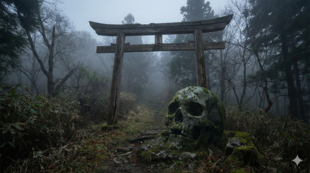 杉沢村へ至る道には、いくつかの明確な「目印」が存在すると語り継がれています。これらはRPGゲームのダンジョンの入り口のように、挑戦者たちに警告を発し、恐怖を煽る役割を果たしています。最も有名なのが、村の入り口に立つ古びた鳥居と、その根元にあるドクロのような形をした岩、通称「ドクロ岩」です。