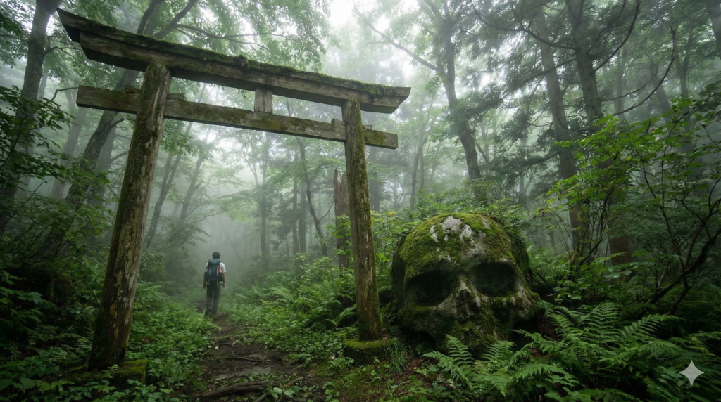 杉沢村への入り口を探す「行ってみた」系のレポートにおいて、必ずと言っていいほど言及されるのが、村の結界としての役割を果たす「古びた鳥居」と、その近くにあるとされる「ドクロの形をした岩」です。伝説では、道路から外れた山道を進んでいくと、突然古びた鳥居が現れるとされています。この鳥居は通常のものとは異なり、異様な雰囲気を漂わせていると言われます。