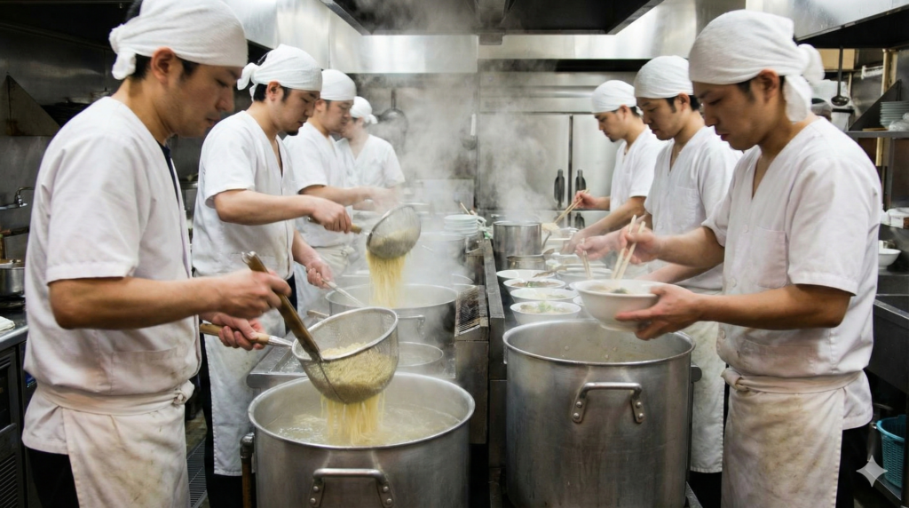 杉田家の厨房を覗くと、白の調理服に身を包んだ職人たちが、無駄のない動きで調理を行っている姿が見られます。彼らの動きはまるでスポーツ選手のようであり、連携プレーによって次々とラーメンが完成していきます。この統率された動きこそ、津村店主が吉村家での修業時代に叩き込まれた精神が息づいている証拠です。