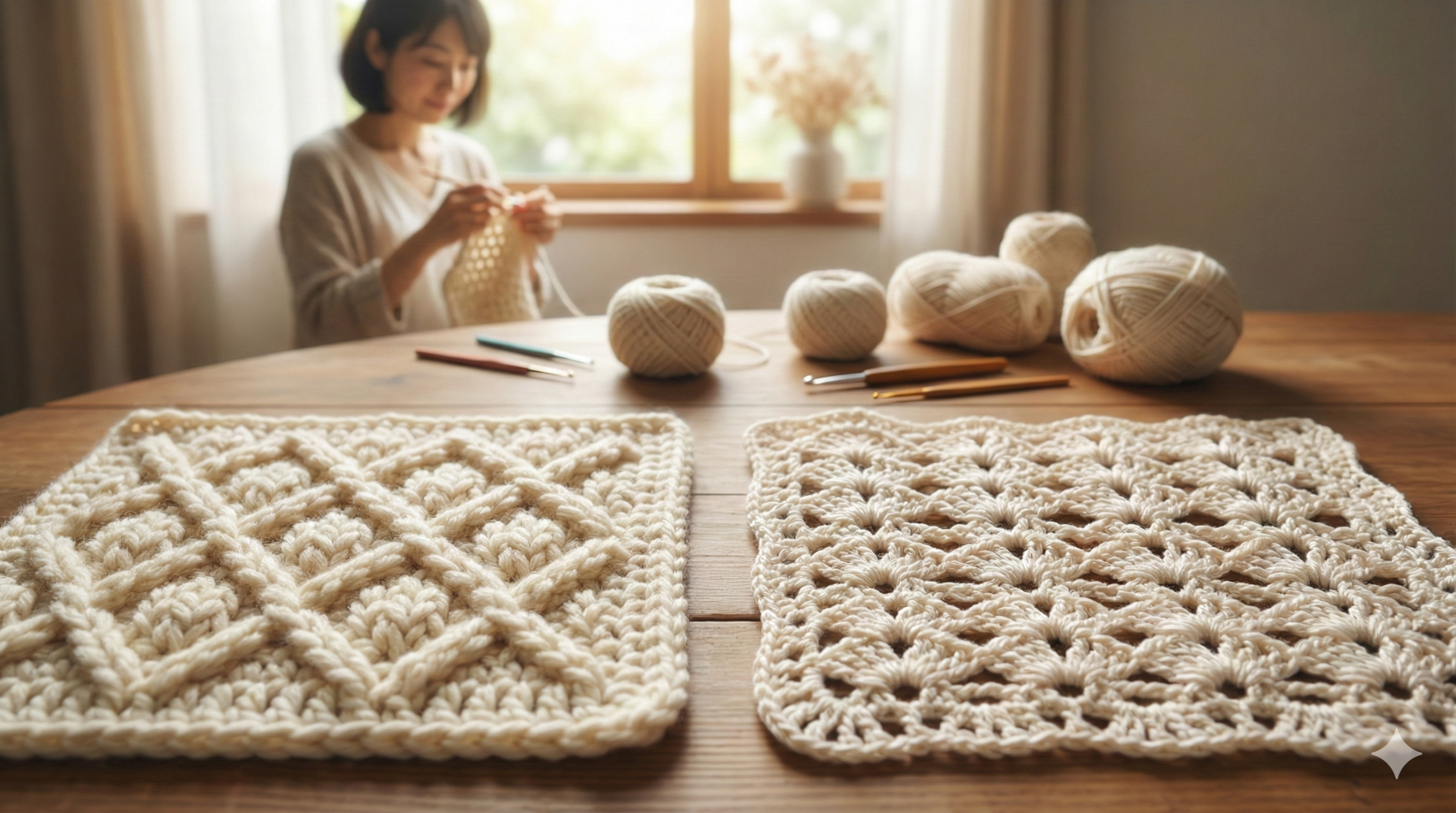 - モチーフが密集して編まれるため、比較的厚みが出て、しっかりとした手触りの編み地になります。