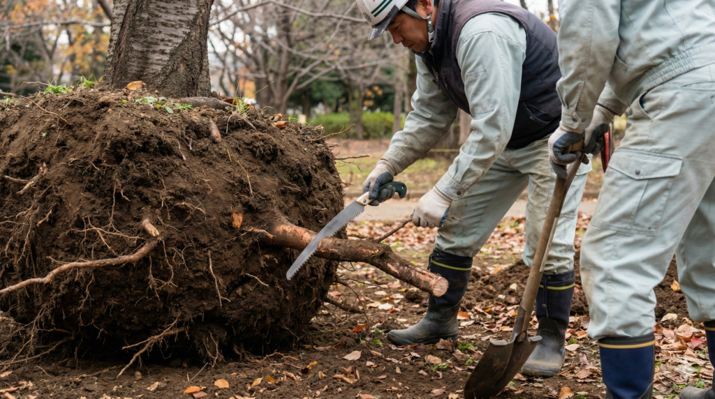 - 樹木の生命活動が停滞する休眠期(通常は秋から冬)に、根鉢の外周に沿って根を切り込みます。
