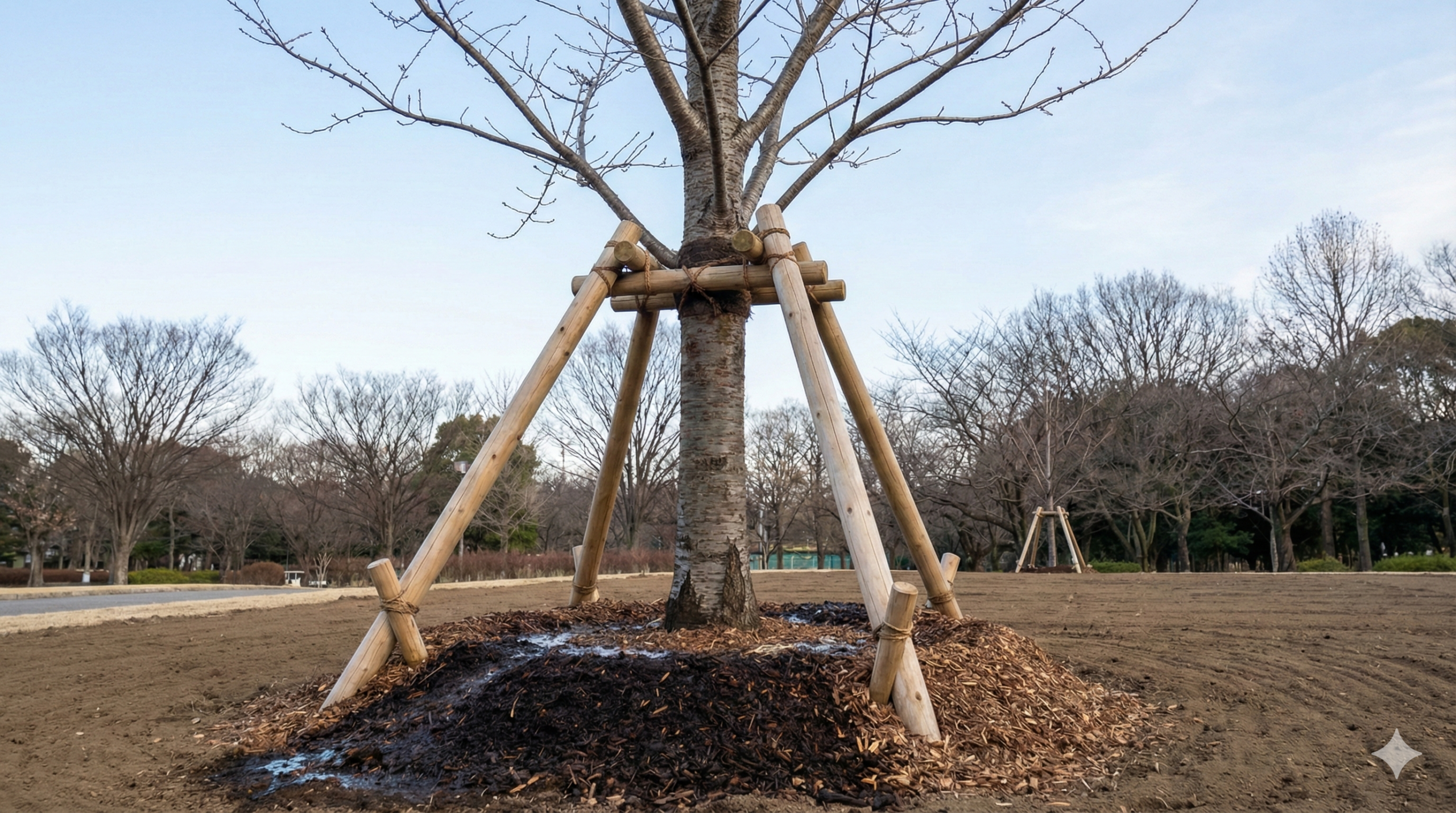 | 支柱の設置 | 根を切ったばかりの樹木は、根の固定力が弱いため、強風や自重で倒れないよう、強固な支柱を設置する。 | 倒木や根鉢の揺れによる根の損傷を防止。 |