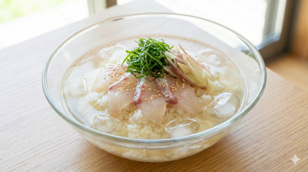 お茶漬けといえば熱々のお湯をかけるのが一般的ですが、梅こんぶ茶の真価は「冷やし茶漬け」においても見事に発揮されます。特に食欲が減退する夏の暑い時期において、冷水で溶いた梅こんぶ茶をかけた冷やし茶漬けは、最高の栄養補給源となります。