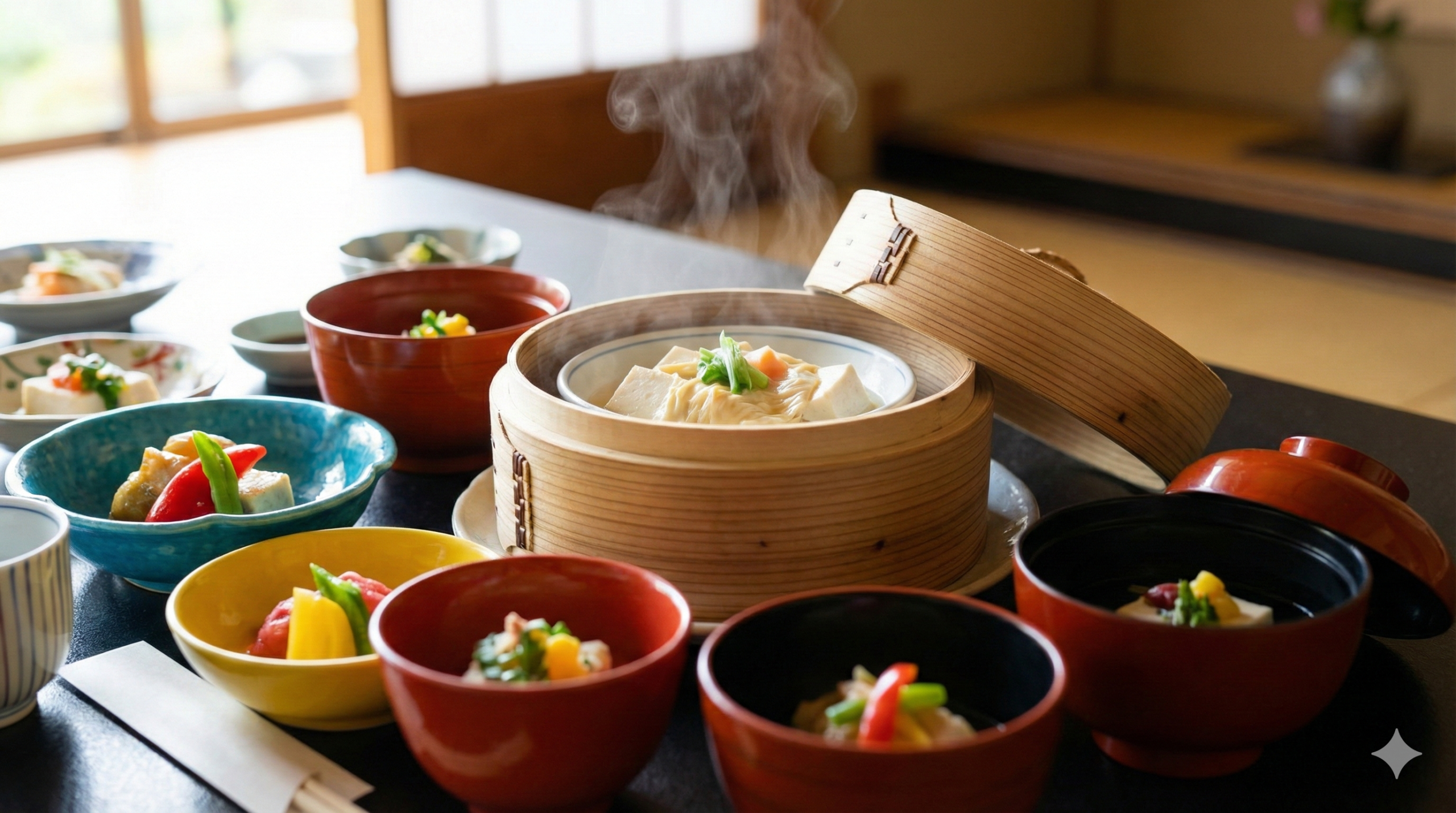 梅の花を代表するメニューである「とうふしゅうまい」や各種湯葉料理は、写真映えするテクスチャの宝庫です。例えば、蒸籠(せいろ)に入った状態で提供されるしゅうまいを撮影する場合、蓋を開けた瞬間に立ち上る白い湯気は、最高のシャッターチャンスとなります。この湯気は、料理の温かさ、出来立ての鮮度、そして香りを視覚的に伝える重要な要素(シズル感)です。逆光気味に撮影することで湯気を際立たせ、ドラマチックな一枚に仕上げることができます。