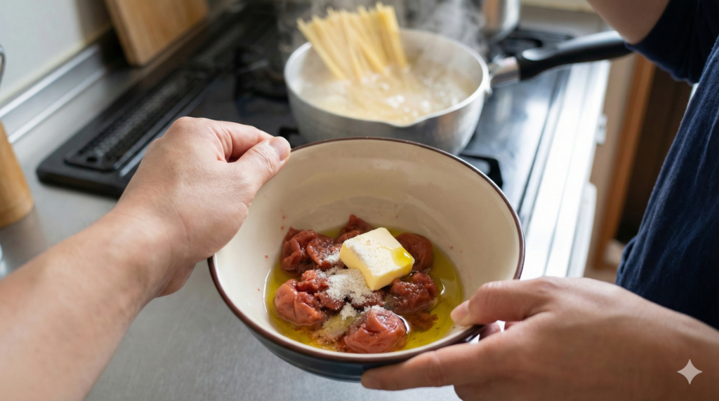 「虚無」としての梅パスタでは、包丁すら使わず、パスタを茹でている間に器の中でソースを完成させるという究極の効率化が図られています。ここでは、洗い物を減らすことや、疲れていても作れるという心理的なハードルの低さが重視されています。しかし、味が犠牲になっているわけではなく、最小限の材料で最大限のパフォーマンスを発揮するための計算がなされています。