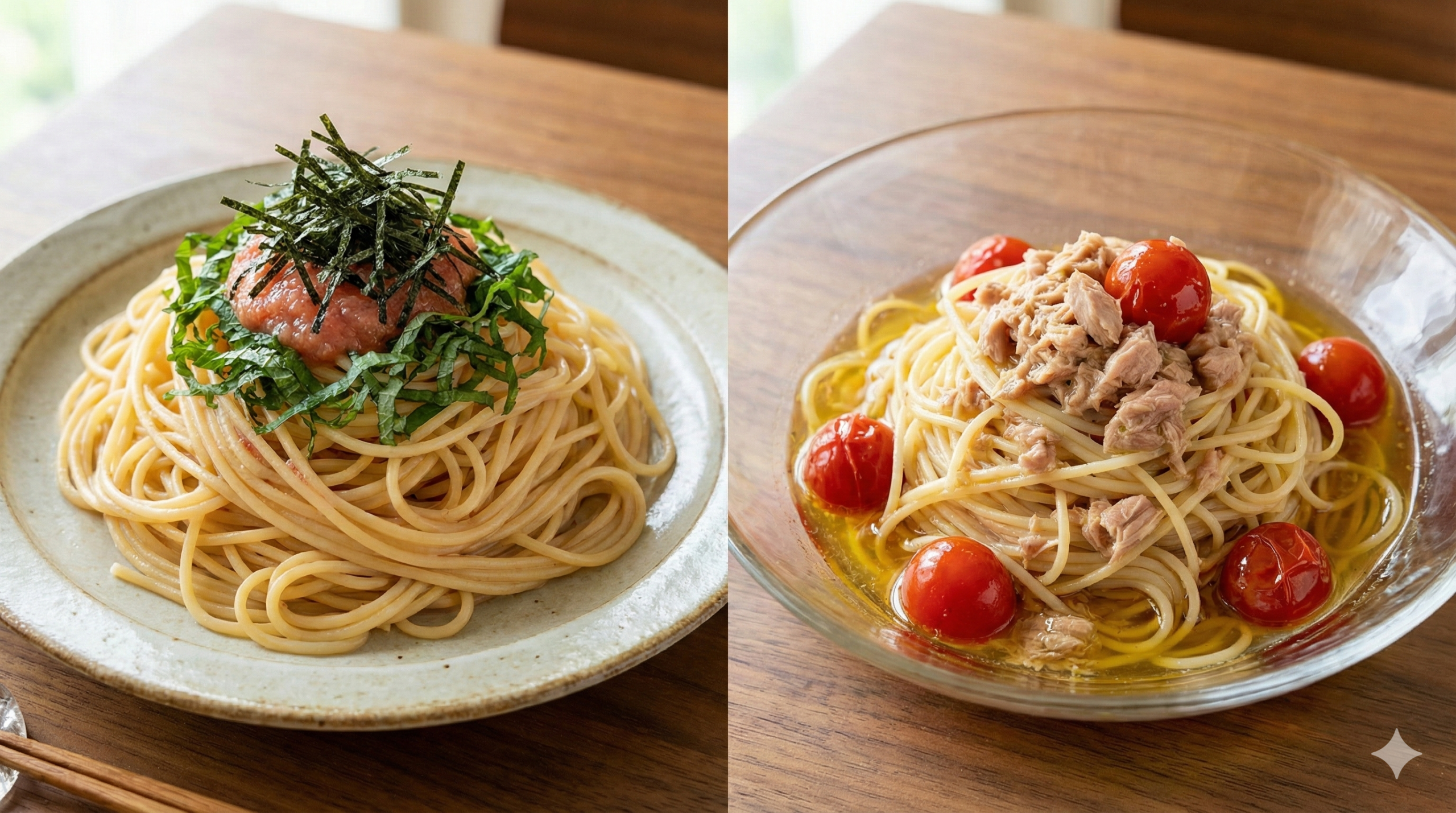 梅とパスタだけのシンプルな構成も美味しいですが、リュウジ氏はそこに相性の良い副材料(トッピング)を加えることで、栄養価と満足度を飛躍的に高めています。中でも頻繁に登場し、最強の組み合わせとされるのが「ツナ(ツナ缶)」と「大葉(シソ)」です。