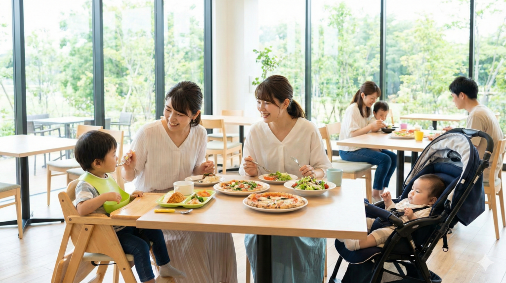 子連れにとって嬉しいポイントは、キッズメニューの充実ぶりです。ハンバーグやエビフライなど子供が大好きなメニューが揃ったプレートランチや、低アレルゲンメニューが用意されていることもあり、アレルギーを持つお子様連れでも安心して利用できる場合があります(詳細は店舗への事前確認をおすすめします)。また、店内には子供用の椅子やカトラリーも完備されており、スタッフの方々も家族連れへの対応に慣れています。