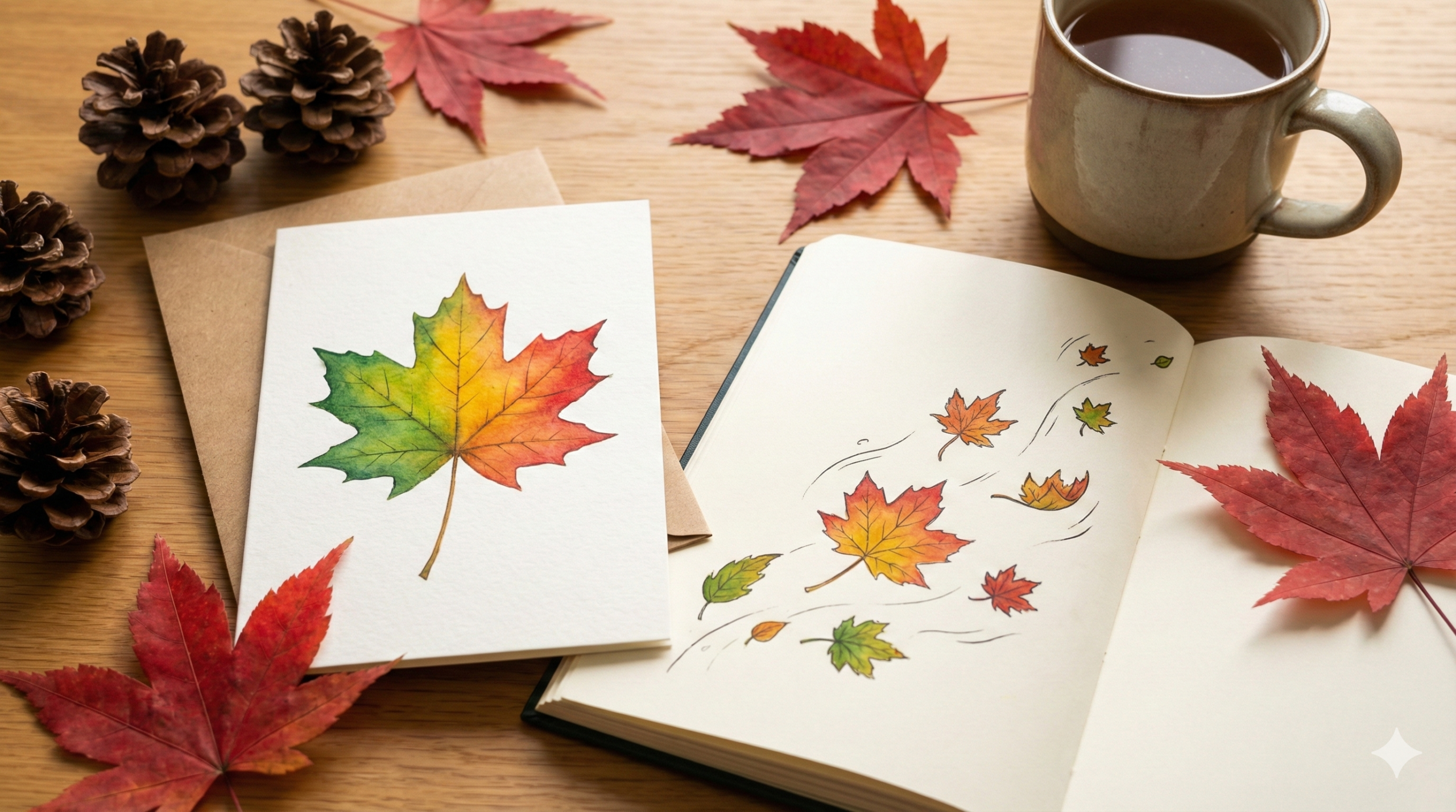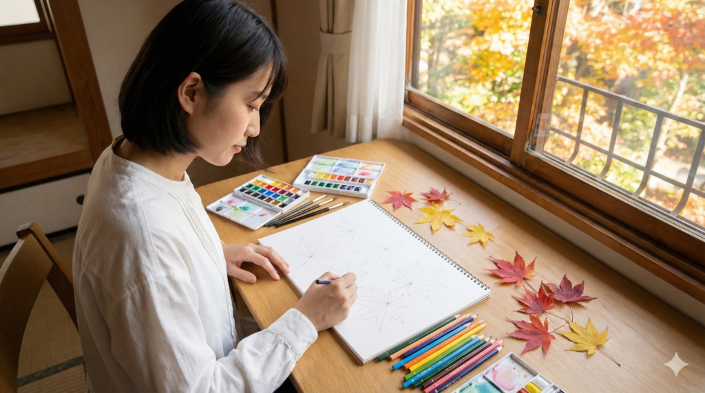 アナログ画材の場合、色鉛筆や水彩絵の具が特におすすめです。秋の紅葉は、一枚の葉の中で緑から黄色、オレンジ、赤へと色が変化していくグラデーションが魅力です。色鉛筆であれば、色を塗り重ねることで柔らかい混色を表現しやすく、初心者でも扱いやすいという利点があります。水彩絵の具を使う場合は、「ウェット・イン・ウェット」という技法を使い、紙が濡れているうちに違う色を滲ませることで、偶然性が生み出す美しい色彩の変化を楽しむことができます。また、輪郭線をはっきりと描くためのミリペンや、筆ペンなどを用意しておくと、和風のテイストを強調することができます。