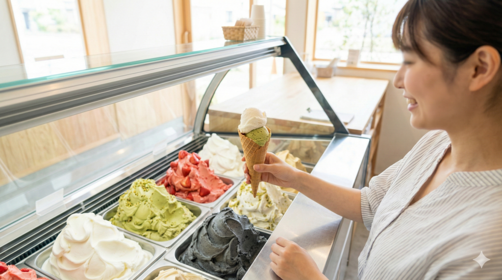 楓ジェラートのベースとなるのは、益田市にある「メイプル牧場」から直送される新鮮な牛乳です。この「牧場ミルク」は、シンプルながらもミルク本来の甘みとコクが強く感じられる一番人気のフレーバーです。余計な添加物を極力抑え、素材の良さをダイレクトに味わえるため、初めて訪れる方にはまず試していただきたい一品です。口どけが滑らかで、後味はすっきりとしているのが特徴です。