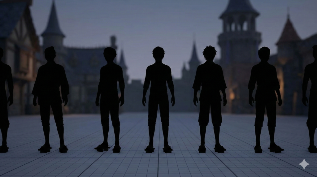 『原神』のキャラクターモデルは、開発効率とアニメーションの共有化のために、いくつかの基本体型(ボディタイプ)に分類されています。男性キャラクターの場合、大きく分けて「長身男性(Adult Male)」と「中背男性(Medium Male / Teen Male)」の2種類が存在します。鍾離やディルック、神里綾人などが「長身男性」に分類される一方で、楓原万葉は「中背男性」のカテゴリーに属しています。
