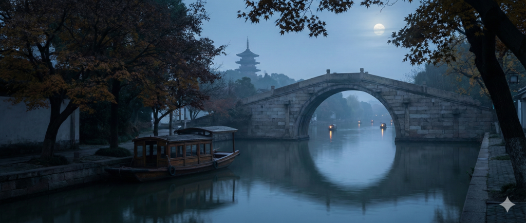 詩の入り口である題名『楓橋夜泊』は、一般的に「ふうきょうやはく」と読みます。この四文字には、詩の舞台と状況が凝縮されています。「楓橋(ふうきょう)」とは、中国の江蘇省蘇州市にある橋の名前です。蘇州は「東洋のベニス」とも称される水郷の街であり、運河が縦横に走る美しい場所です。その運河にかかる一つの橋、それが楓橋です。「夜泊(やはく)」とは、夜に船を停泊させることを意味します。つまり、この題名は「楓橋という場所で、夜、船を停泊させて一夜を過ごす」という状況を端的に表しているのです。読み方として注意すべき点は、「ふうきょう」の「ふう」が長音になること、そして「やはく」という言葉が持つ、旅の寂寥感を含んだ響きを感じ取ることです。単なる地名と動作の説明ではなく、これから始まる孤独な夜の物語のプロローグとして読む意識が重要です。
