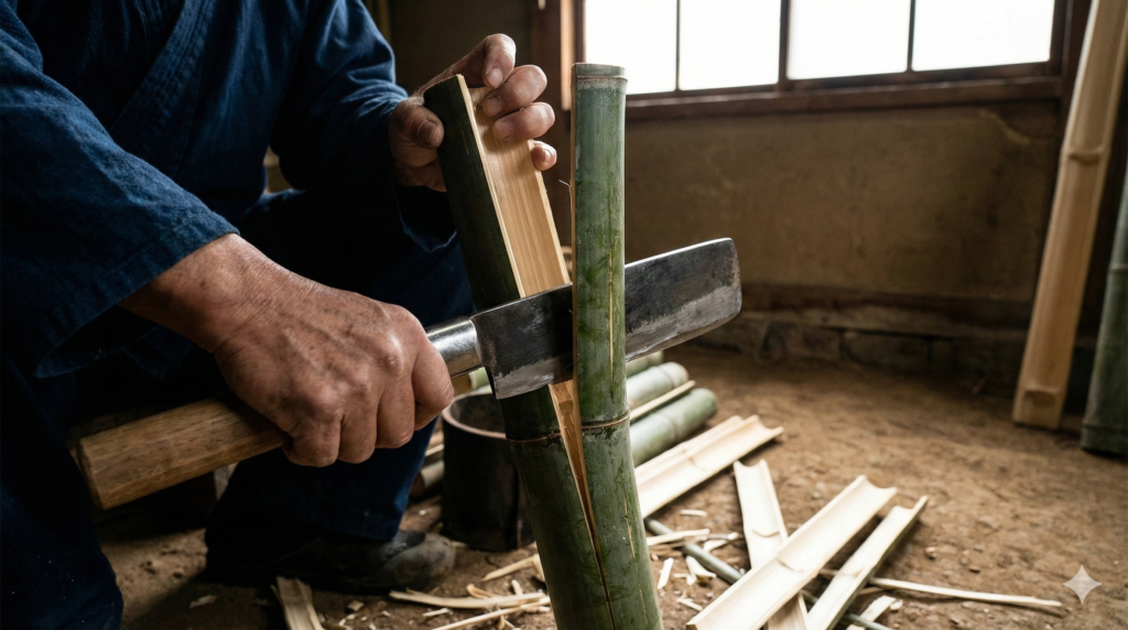 乾燥を終えた竹は、竹刀の長さに合わせて切断され、縦に割られます。一本の竹刀は通常四枚の竹片(四つ割り)から構成されるため、太さに応じて六つ割りや八つ割りにしたものを組み合わせて使用します。しかし、自然の竹は必ず曲がりやねじれを持っています。そのままでは真っ直ぐな竹刀にはなりません。そこで行われるのが「矯め(ため)」と呼ばれる作業です。