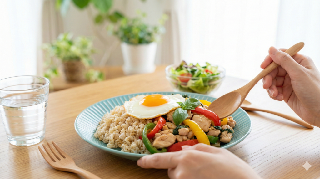 竹脇まりなが紹介するガパオライスが、一般的なタイ料理店のものやコンビニエンスストアのお弁当と決定的に異なるのは、その「食材選び」と「栄養バランスの設計」にあります。彼女のレシピは、単にカロリーを減らすことだけを目的としていません。体を作る材料となるタンパク質をしっかりと摂取し、エネルギー代謝に必要なビタミンやミネラルを補給しつつ、血糖値の急上昇を抑える工夫が随所に散りばめられています。ここでは、なぜ彼女のガパオライスが痩せる体作りに貢献するのか、そのメカニズムを詳細に分析していきます。