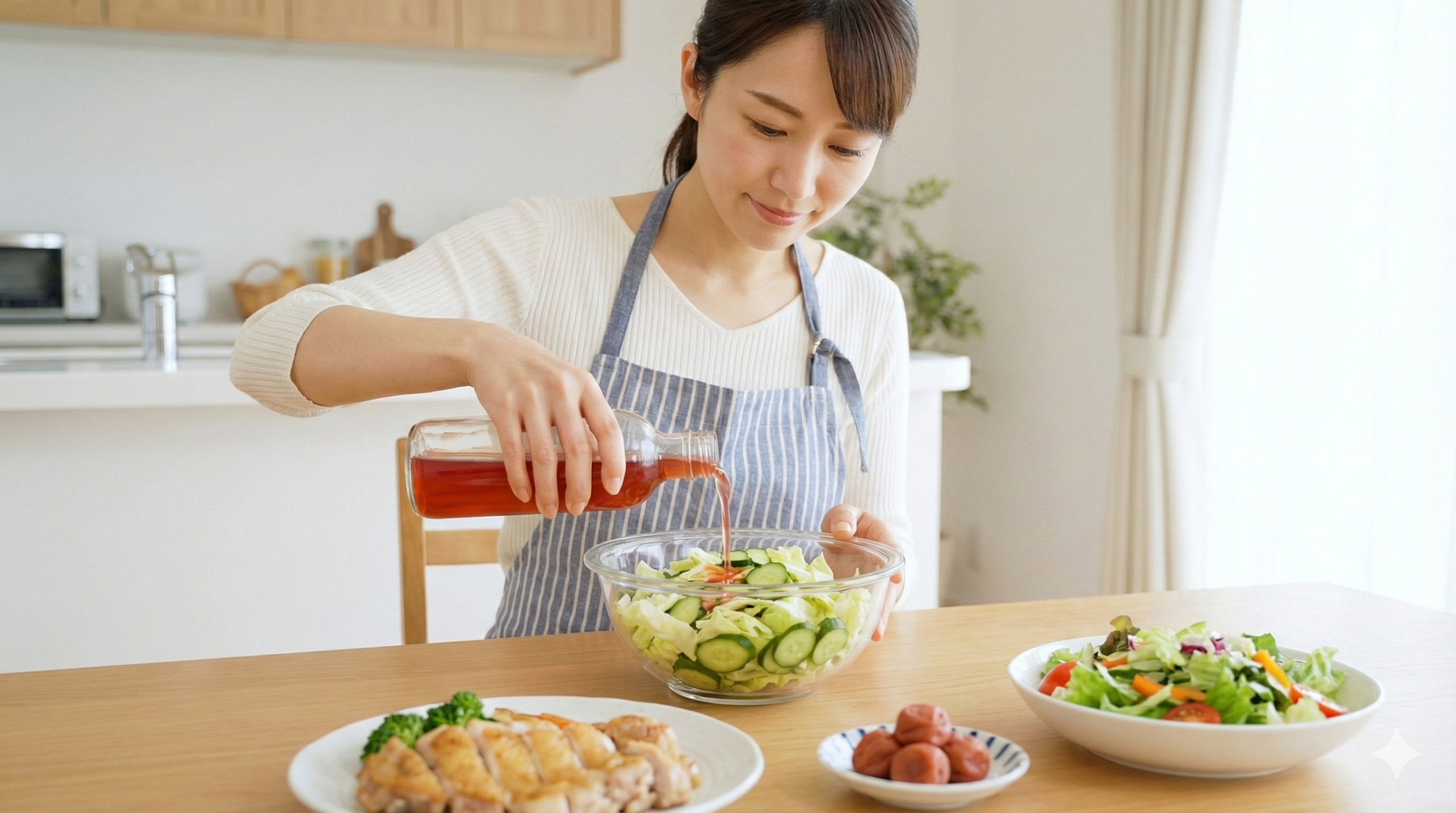 この特性を活かして、自家製ドレッシングを作ってみましょう。オリーブオイルやごま油などの良質な油と赤梅酢を、2対1の割合で混ぜ合わせるだけで、風味豊かなドレッシングが完成します。お好みで胡椒やハーブ、すりごまなどを加えれば、サラダの種類に合わせて無限にアレンジが可能です。市販のドレッシングには多くの添加物や糖分が含まれていることがありますが、赤梅酢ドレッシングなら無添加でヘルシーです。紫蘇の香りが野菜の青臭さをマスキングしてくれるため、野菜嫌いな子供でも食べやすくなるという効果も期待できます。