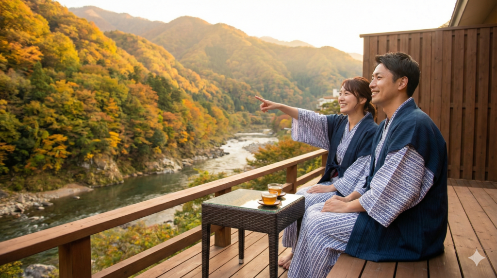 特に露天風呂タイプの貸切風呂では、四季折々の風景を独占することができます。春には新緑が鮮やかに山を彩り、夏には清涼感あふれる川のせせらぎが聞こえ、秋には燃えるような紅葉が視界を埋め尽くし、冬には静寂に包まれた雪景色が広がります。これら自然のアートを、誰にも邪魔されることなく二人だけで眺めることができるのは、何物にも代えがたい贅沢です。